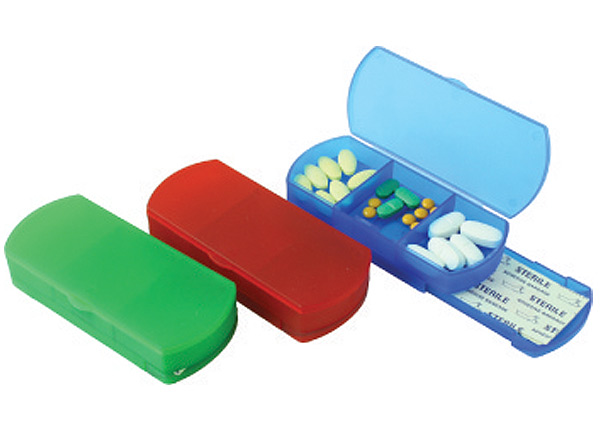 PillB003.0300 3 COMPARTMENTS WITH PLASTERS 11.8x5x2.5cm PillB003 COMPARTMENTS WITH PLASTERS 11.8x5x2.5cm a) code: PillB003.0300 b) color available: Green, Red, Blue c) minimum quantity: No minimum quantity d) size: PillB003.0300